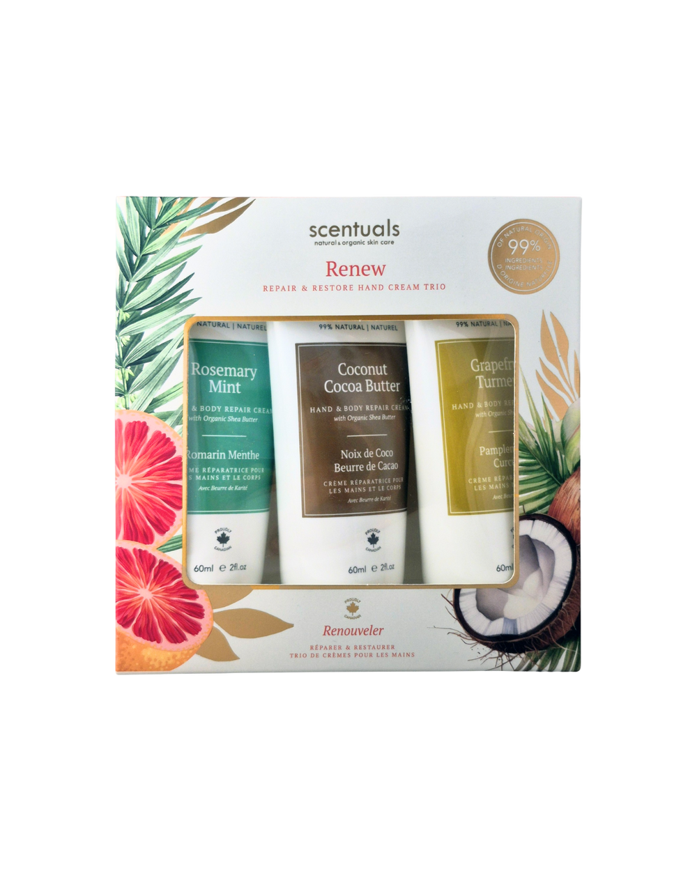 Indulge your hands in luxurious care with the Renew Repair & Restore Hand Cream Trio, featuring three sensorial, botanically enriched formulas: Rosemary Mint, Coconut Cocoa Butter, and Grapefruit Turmeric. Each cream is thoughtfully crafted to provide deep hydration, restore softness, and transform everyday hand care into a ritual of wellness and indulgence with rich Shea Butter, Cacao Butter, Argan Oil and soothing Aloe Vera.