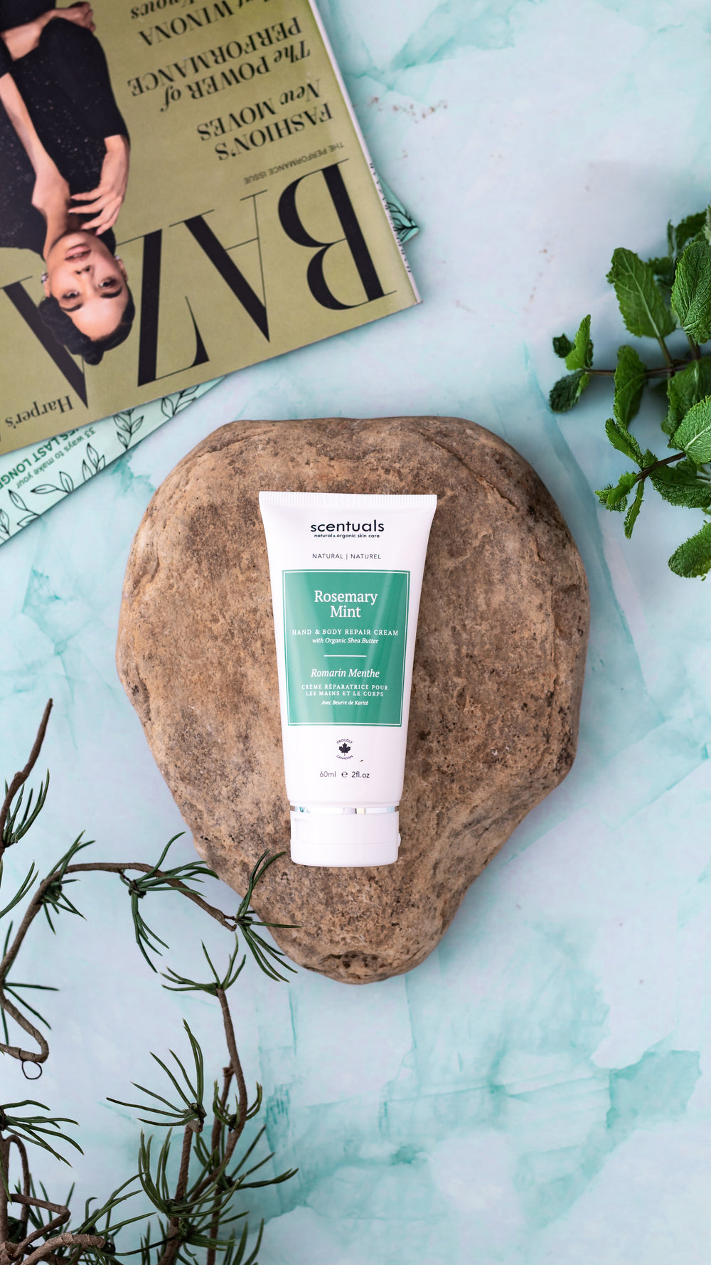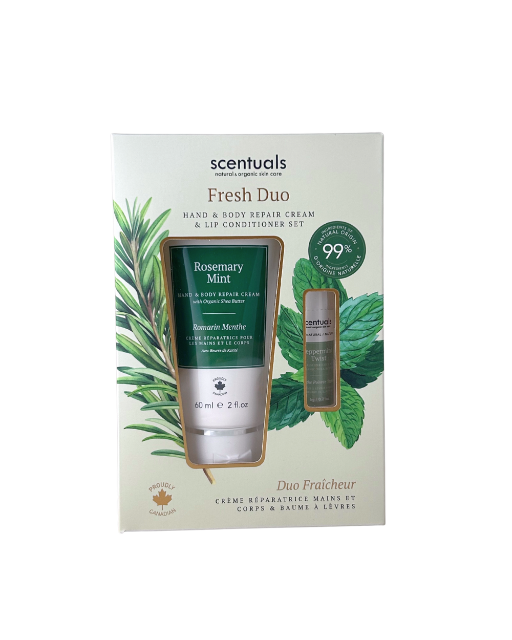 A minty duo of daily essentials: Hand Repair Cream & Lip Conditioner.